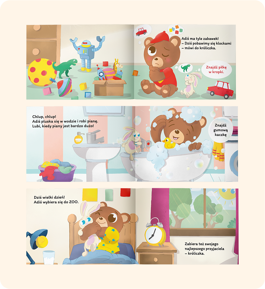 Z Misiem Adisiem można iść na plac zabaw, do ZOO lub pokazać, że przygotowanie się do snu i poranna rutyna to ważna rzecz!