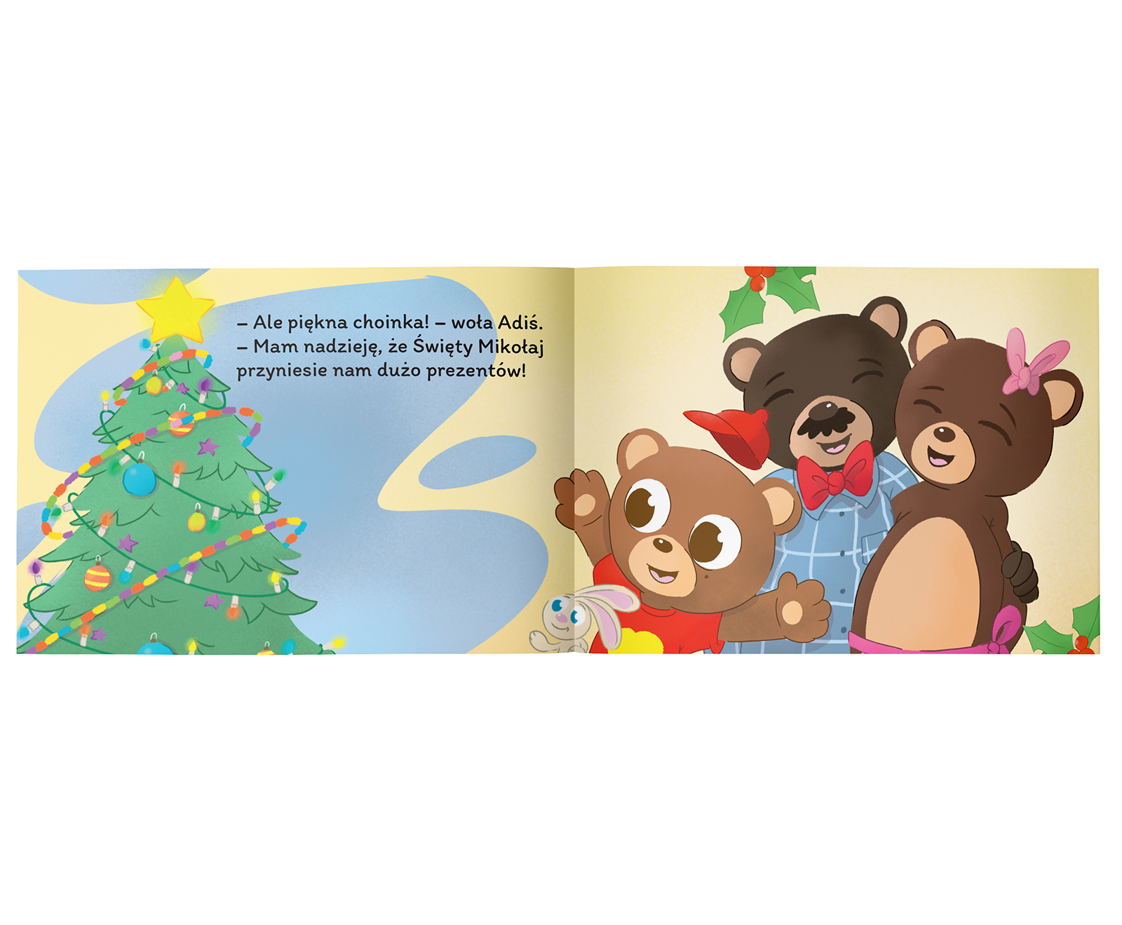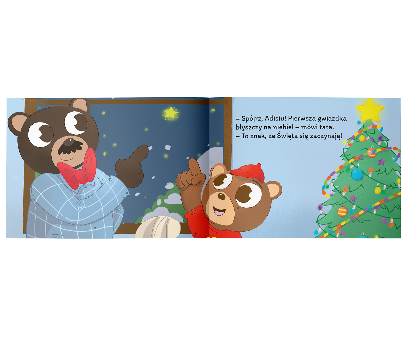 Miś Adiś i Pierwsza Gwiazdka. Za oknem pada biały puch, a Adiś z pluszowym króliczkiem wchodzą w świąteczny nastrój: pieką pachnące pierniczki i robią ozdoby na choinkę. Razem z mamą i tatą ubierają drzewko, czekając, aż na niebie zabłyśnie pierwsza gwiazdka. Gdy nadchodzi Wigilia, są kolędy, uśmiechy i… prezenty spod choinki!